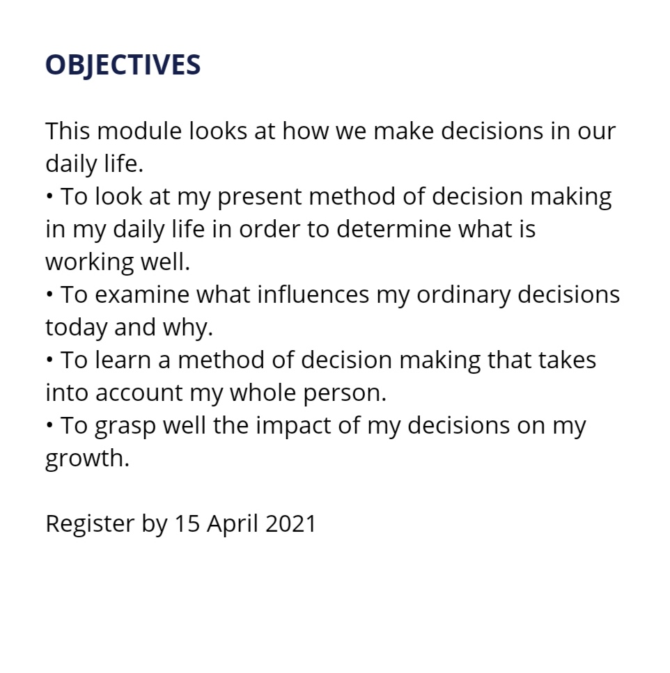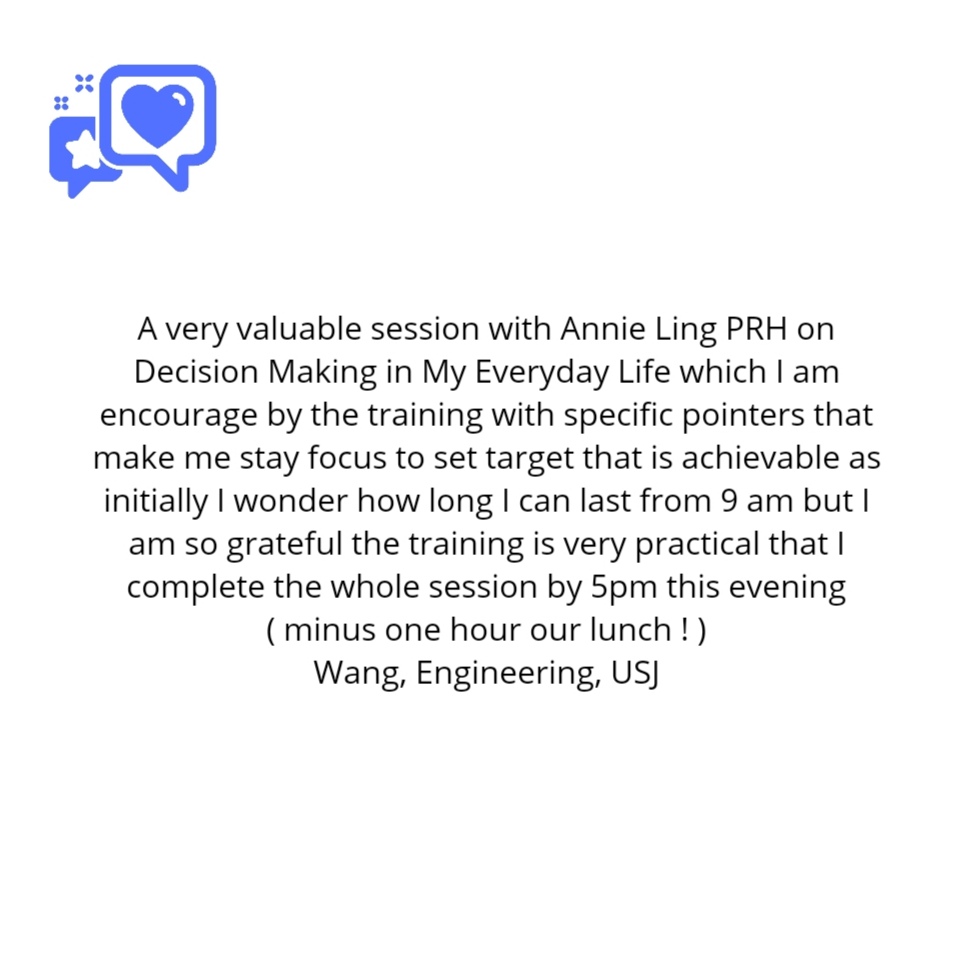 For more testimonials from past participants on Decision Making in My Everyday Life and other PRH Workshops. Click here.